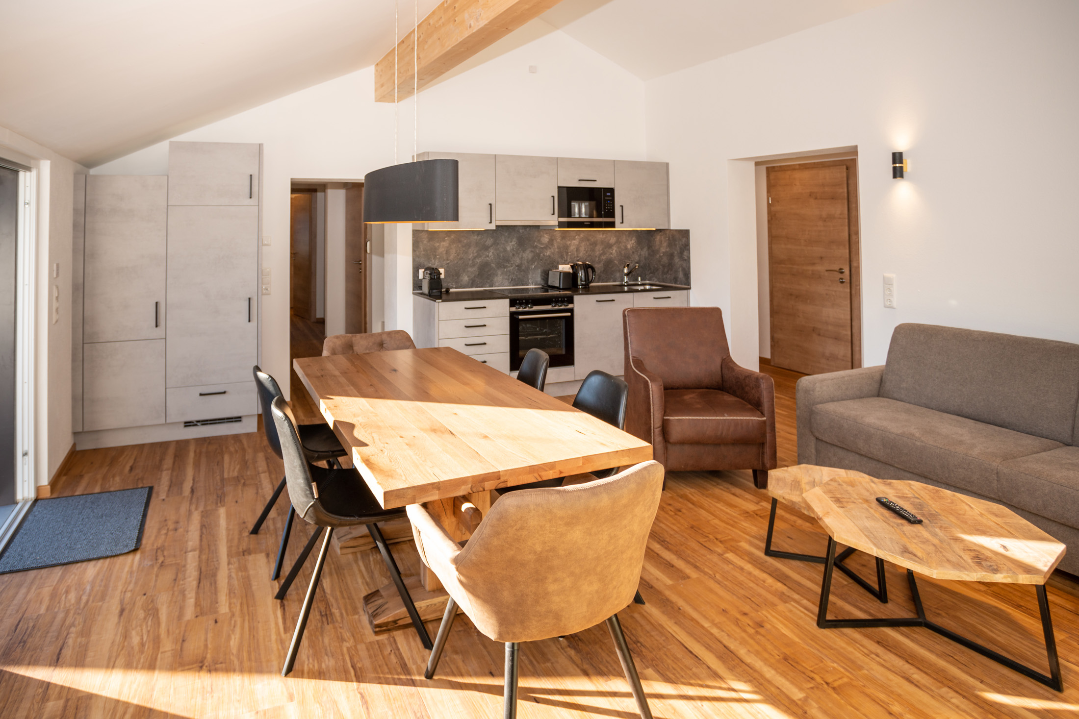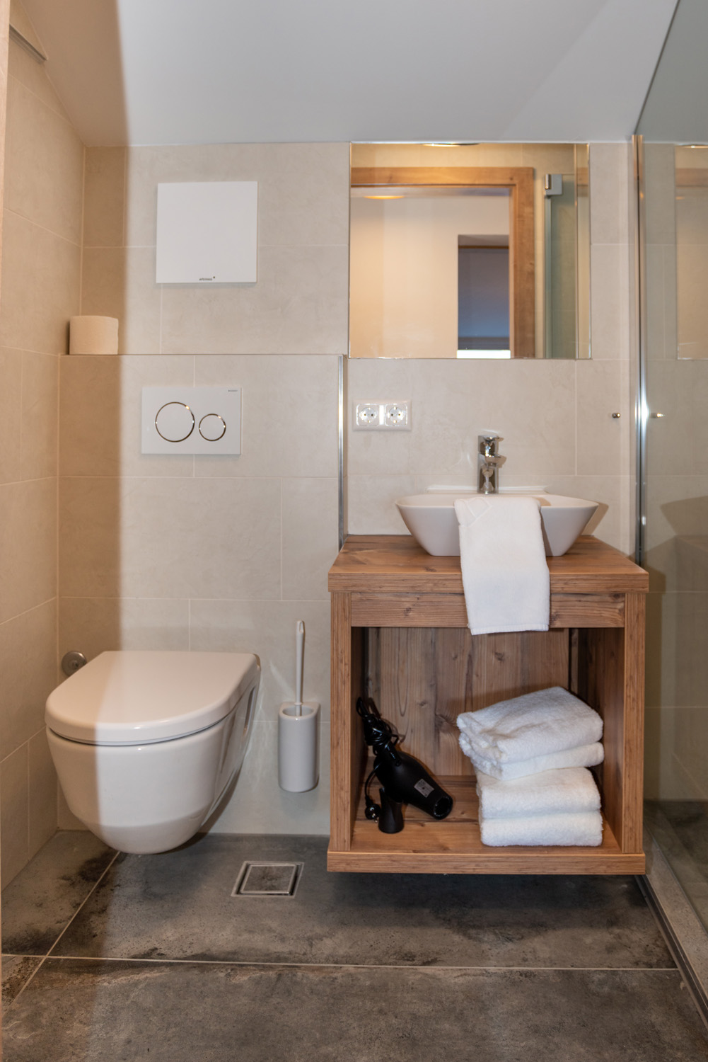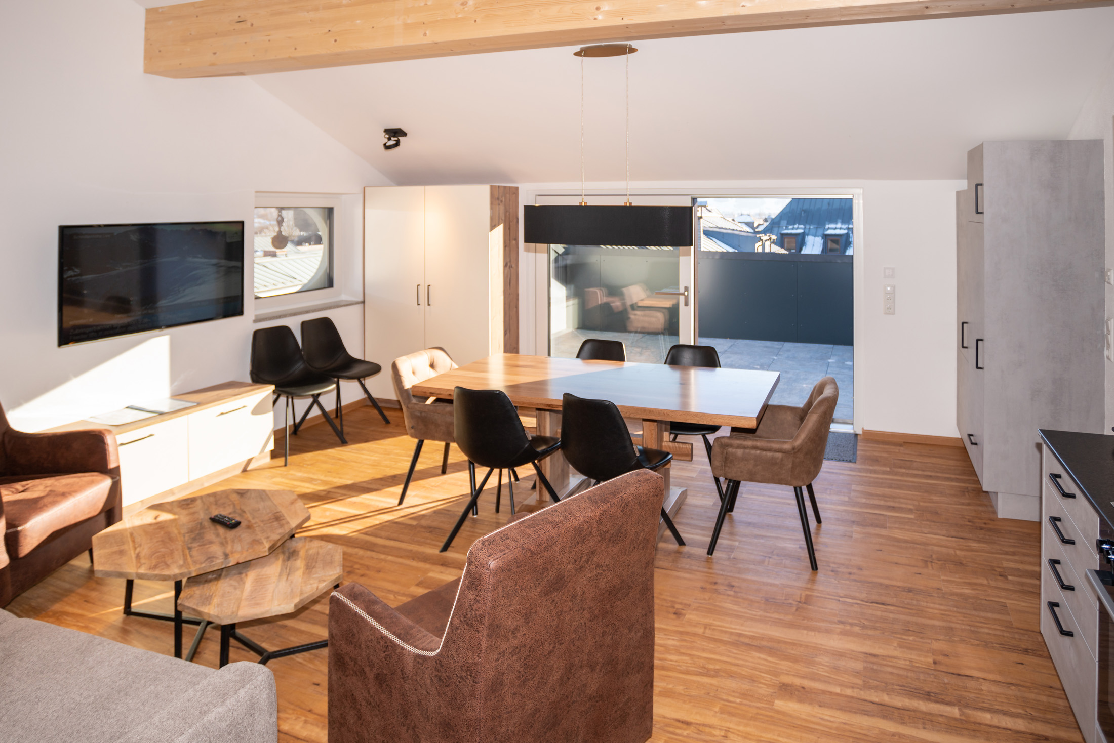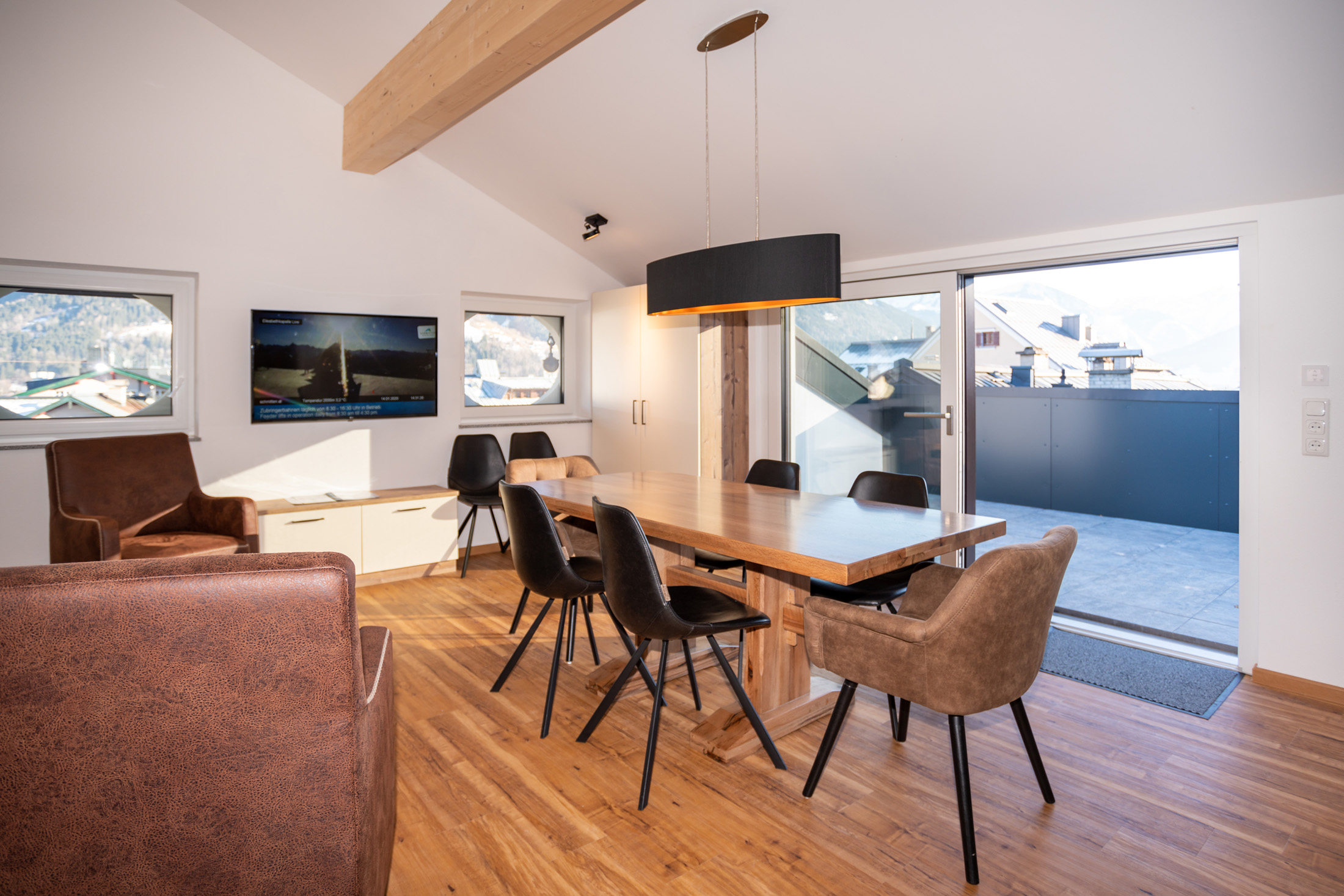 Das absolute Highlight des Hauses ist das Penthouse, das mit seiner großzügigen Dachterrasse einen einmaligen Blick auf den See, die Berglandschaft und Zell am See bietet. Neben drei Schlafzimmern mit je einem Flatscreen-TV bietet ein Schlafsofa im Wohn- und Essbereich Platz für zwei weitere Personen. Außerdem verfügt der Wohnbereich über einen Flatscreen-TV und einen Esstisch mit Platz für bis zu acht Personen. Die Küche ist vollausgestattet. Dieses Appartement bietet Ihnen den Komfort von drei Badezimmern, davon eines „en suite“ mit Dusche und Waschbecken, ein Badezimmer mit Dusche, Waschbecken und WC. Außerdem ein weiteres, separates WC.