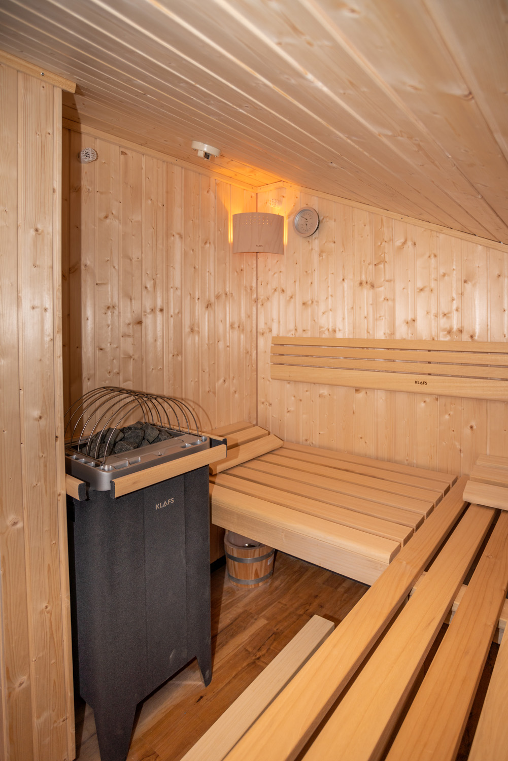 Die großzügige Sauna (Platz für bis zu 5 Personen) bietet direkten Zugang zu einem 3. Badezimmer mit Dusche, Waschbecken und WC. Das WLAN im gesamten Innenbereich kostenfrei benützbar.