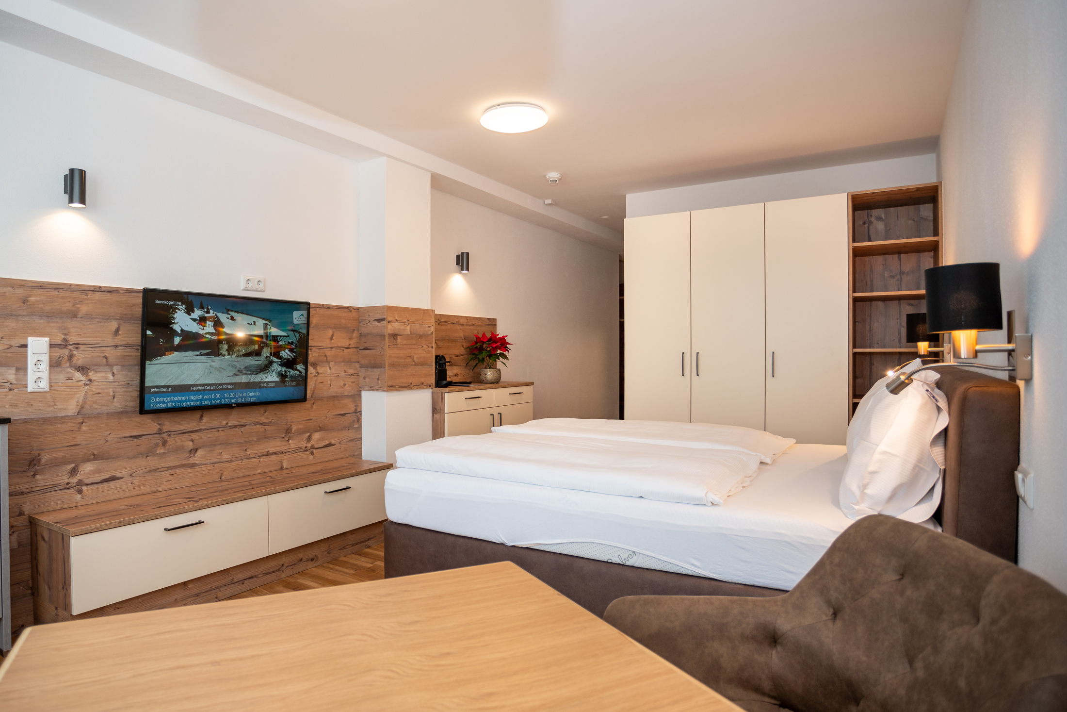 The Superior Studio is suitable for up to 2 persons and has a living and dining area with a box spring bed and a flat screen TV. The cosy studio also offers a fully equipped mini kitchen with dining table for two people. The spacious bathroom offers a shower, washbasin and WC as well as a private Finnish sauna (space for 2 persons). You have free access to the highspeed WLAN
