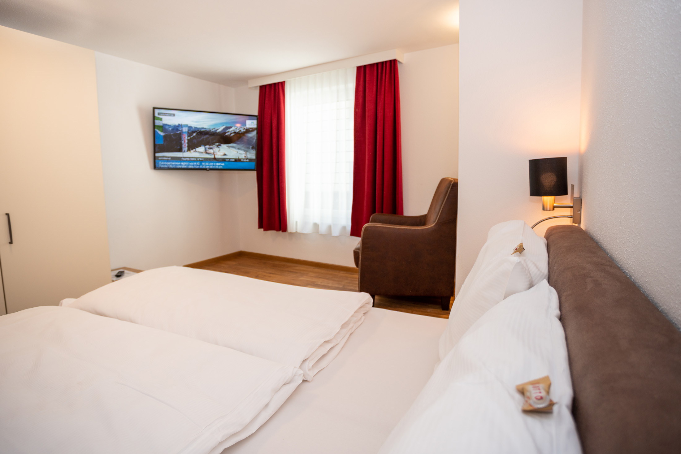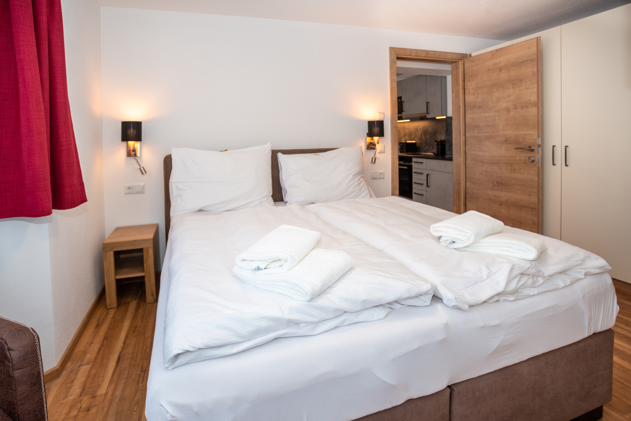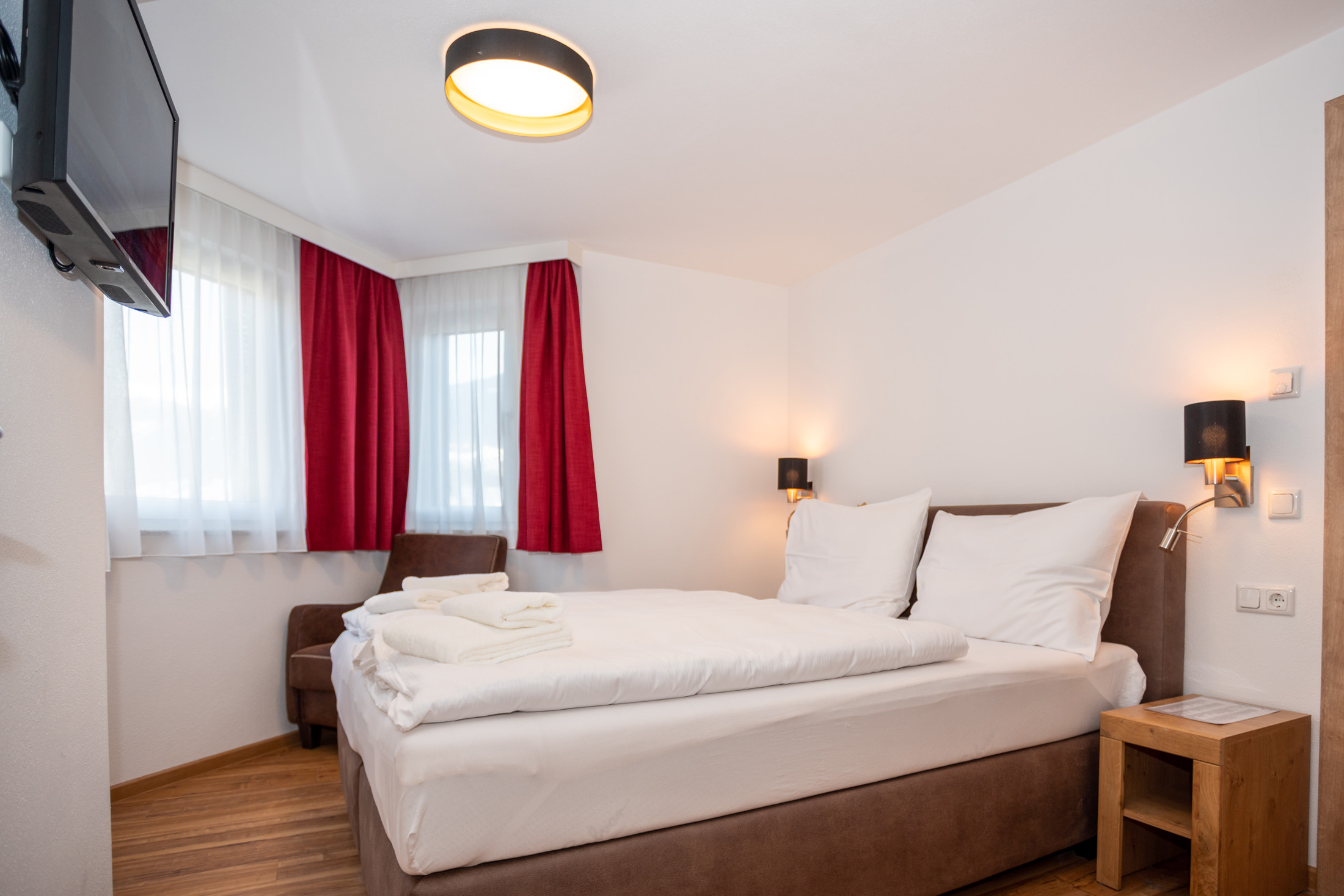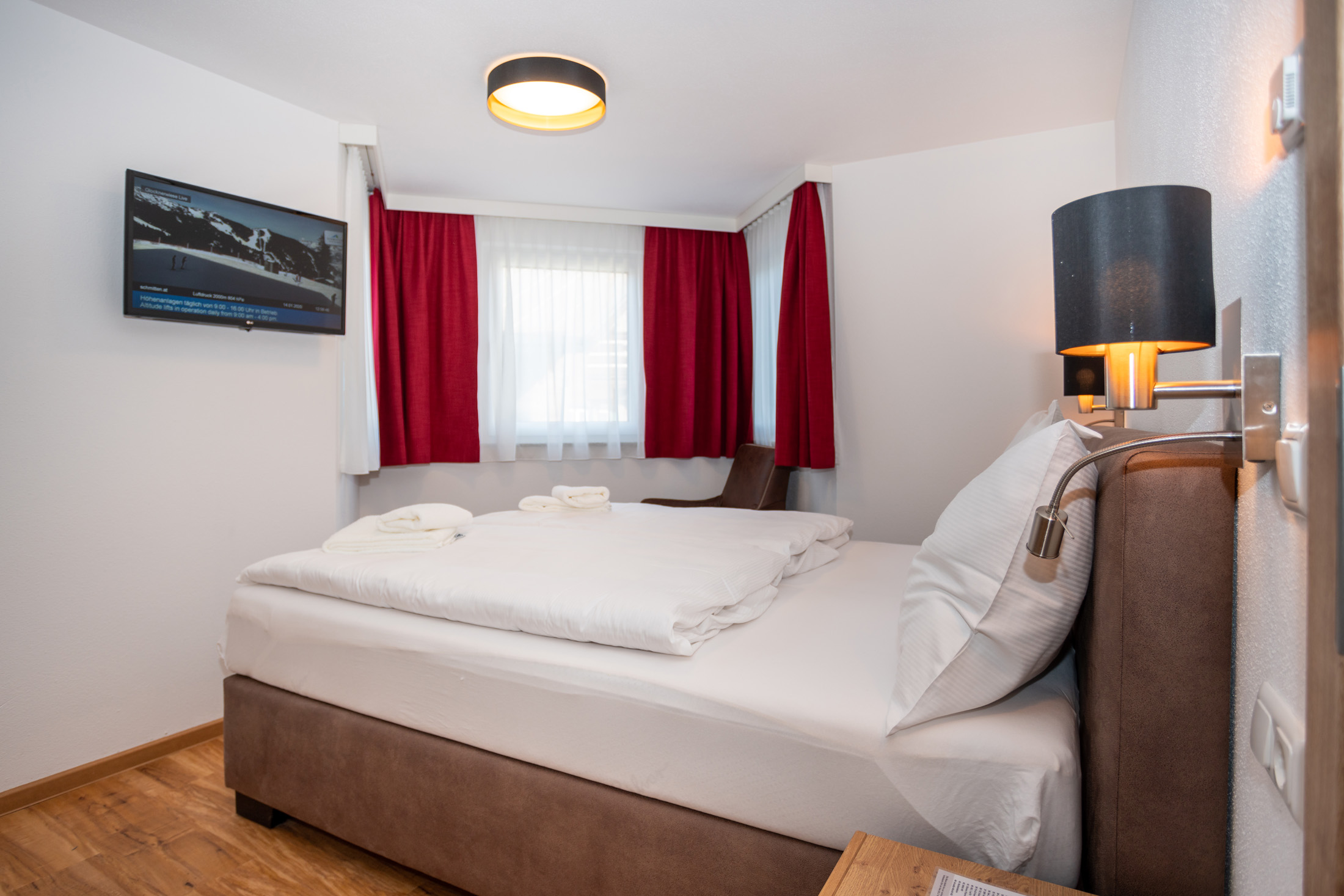 The deluxe apartment offers three bedrooms, each with a box spring bed and a flat screen TV. The living and dining area is equipped with a sofa bed for two people and flat screen TV. The fully equipped kitchen offers a dining table with space for up to eight people. This apartment has three bathrooms; one bathroom „en suite“ with shower and washbasin, another bathroom „en suite“ with shower, washbasin and toilet and a third bathroom with shower, washbasin, toilet and infrared sauna (space for 2 persons). A separate WC is also available. The WLAN is free to use. As a further highlight you can enjoy the wonderful view of the mountains and the city from your balcony.