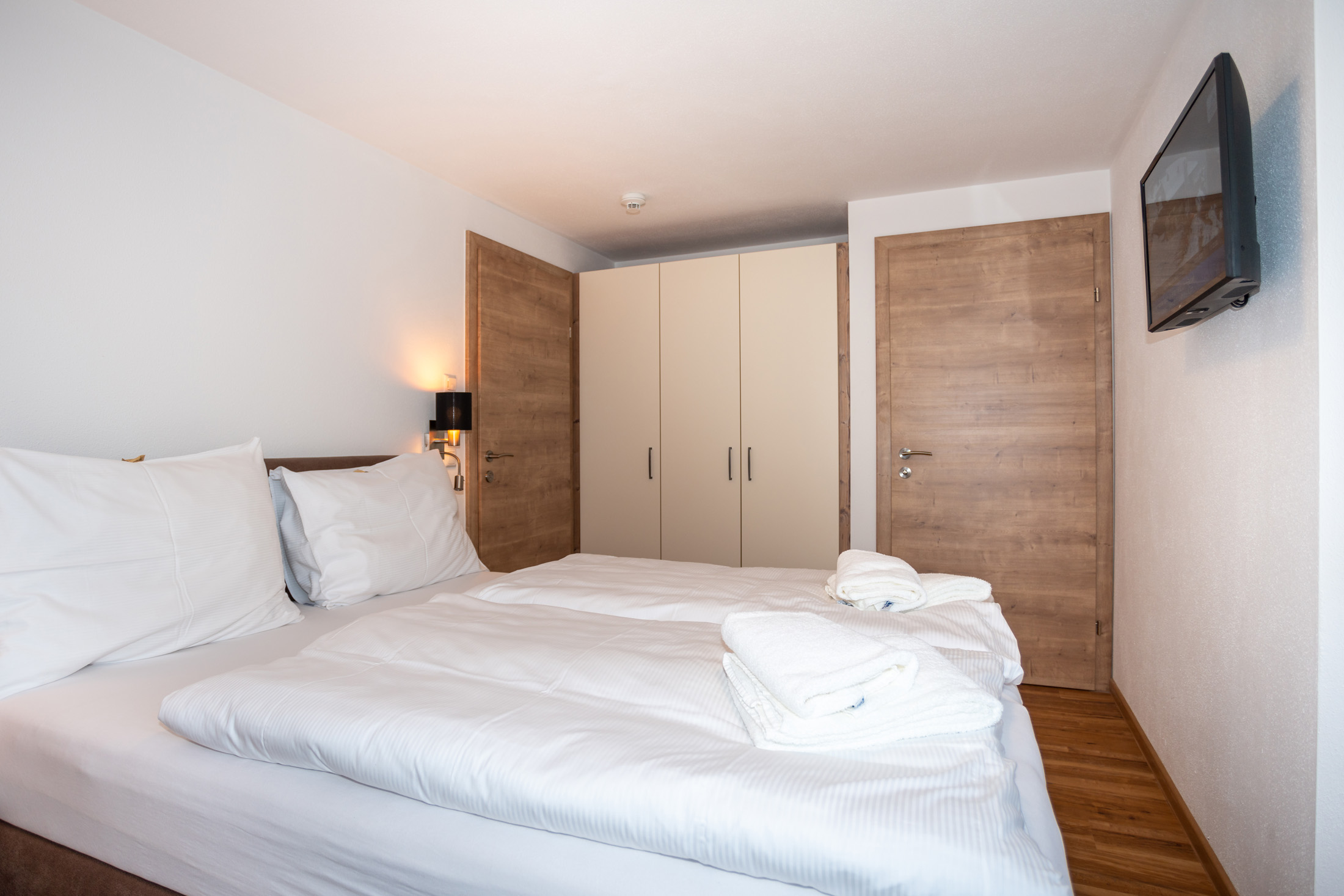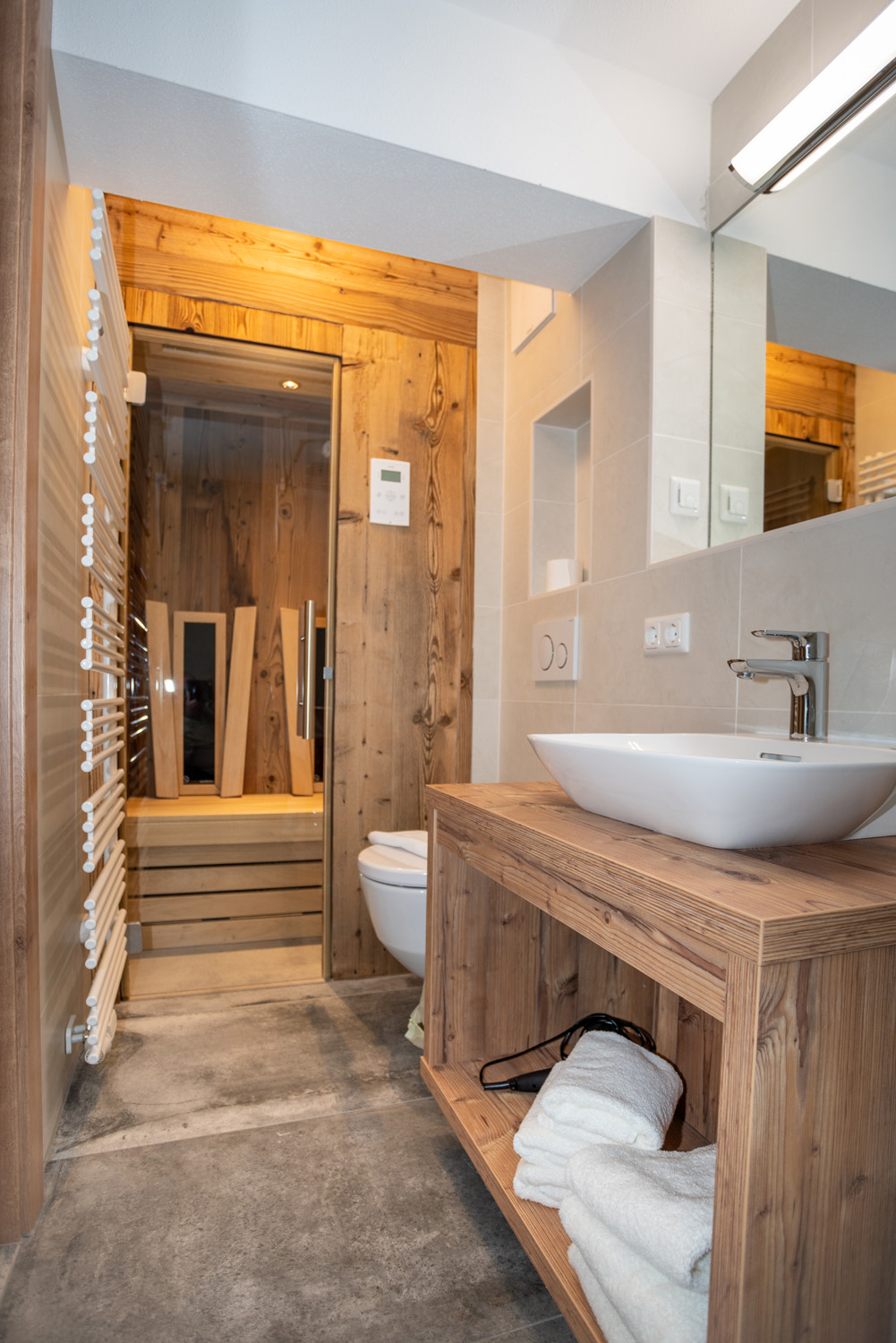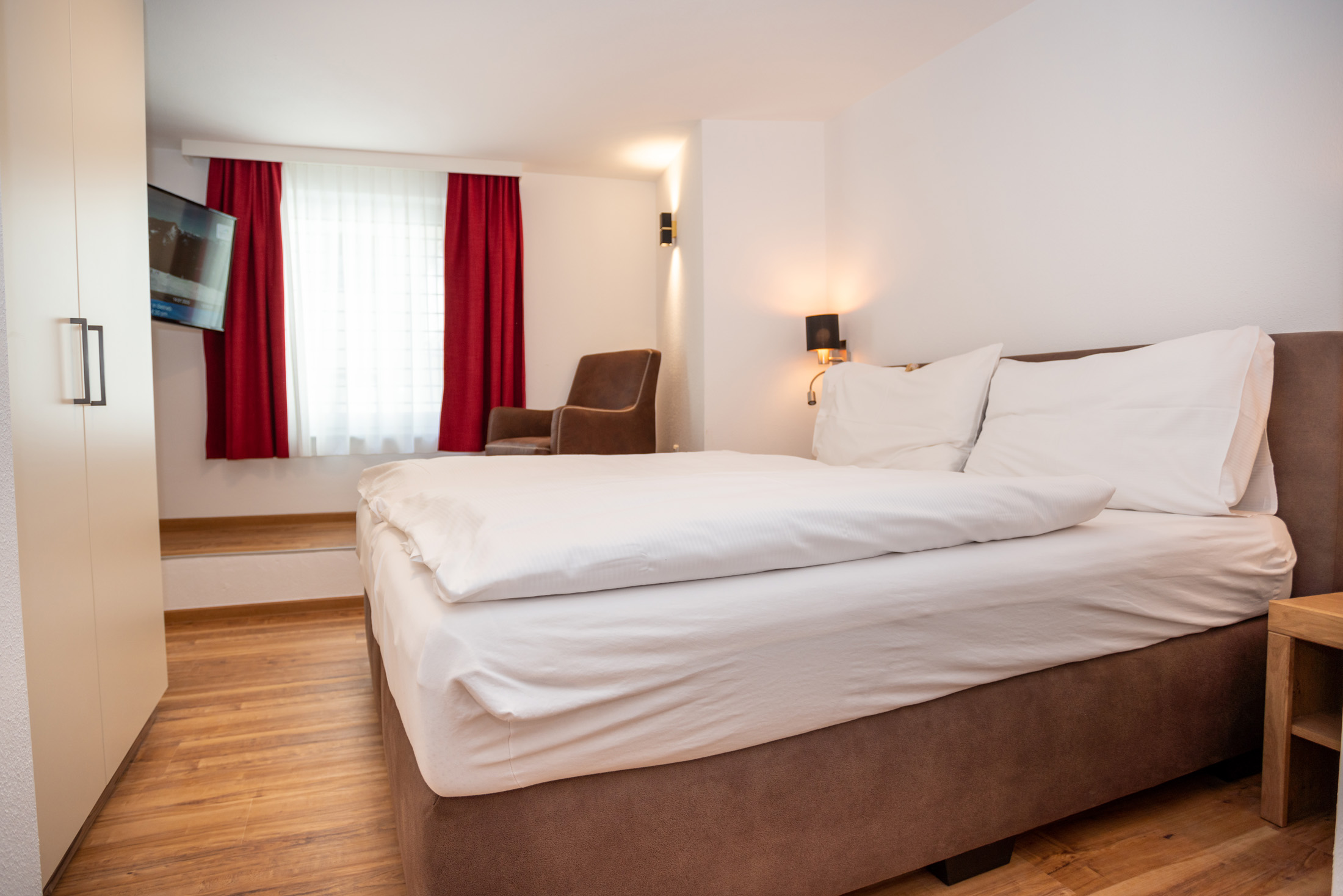 The deluxe apartment offers three bedrooms, each with a box spring bed and a flat screen TV. The living and dining area is equipped with a sofa bed for two people and flat screen TV. The fully equipped kitchen offers a dining table with space for up to eight people. This apartment has three bathrooms; one bathroom „en suite“ with shower and washbasin, another bathroom „en suite“ with shower, washbasin and toilet and a third bathroom with shower, washbasin, toilet and infrared sauna (space for 2 persons). A separate WC is also available. The WLAN is free to use. As a further highlight you can enjoy the wonderful view of the mountains and the city from your balcony.