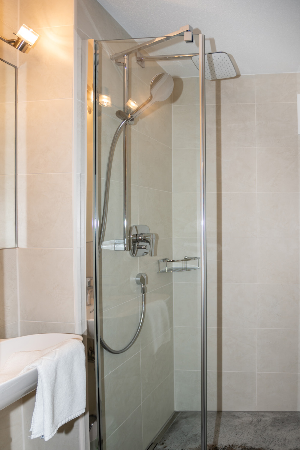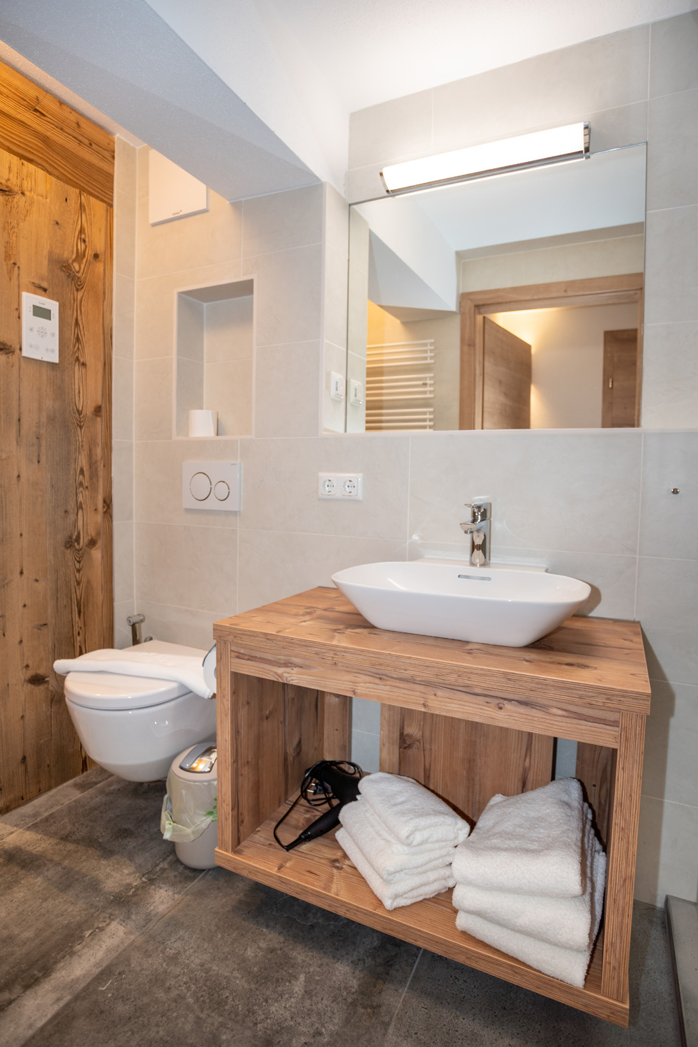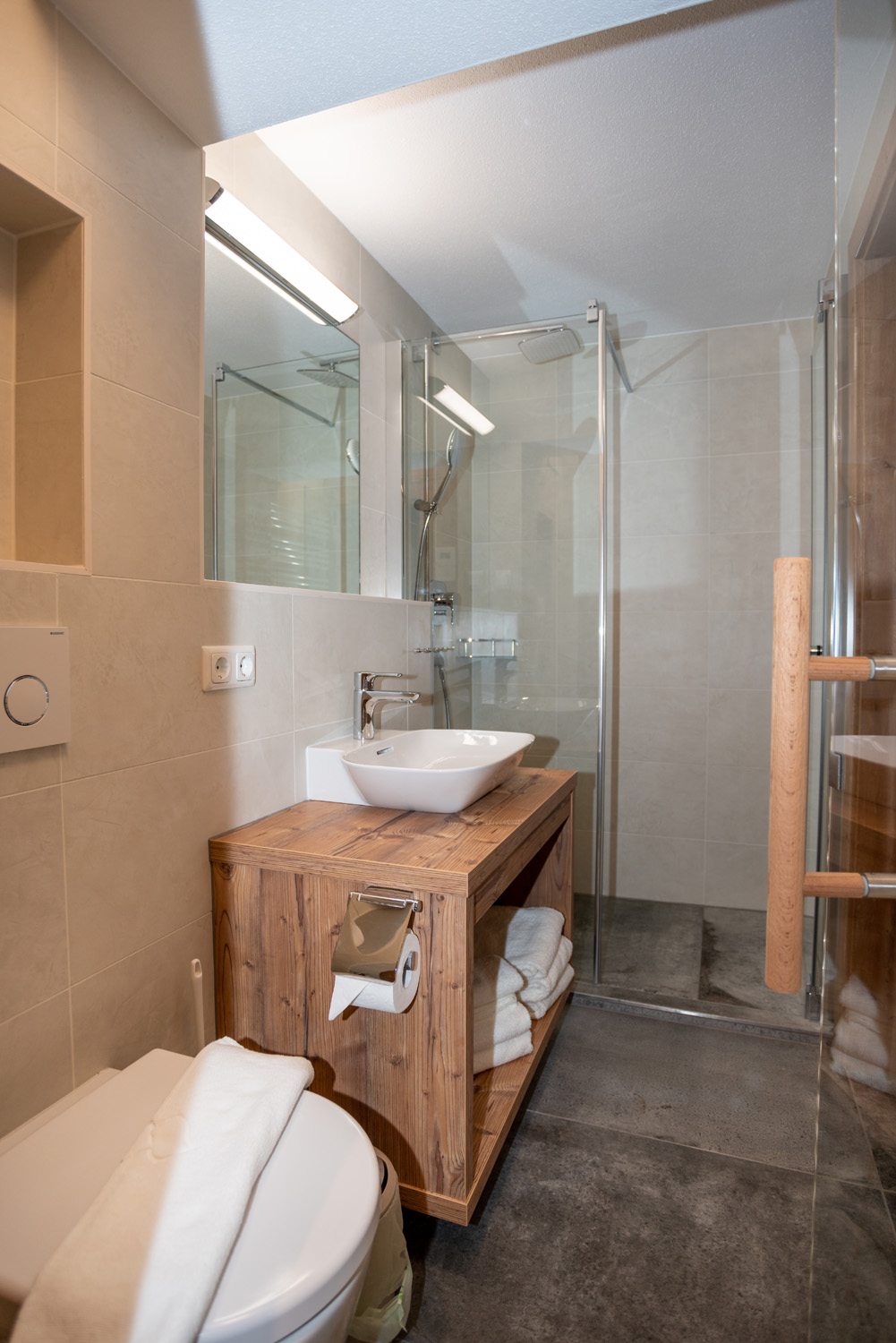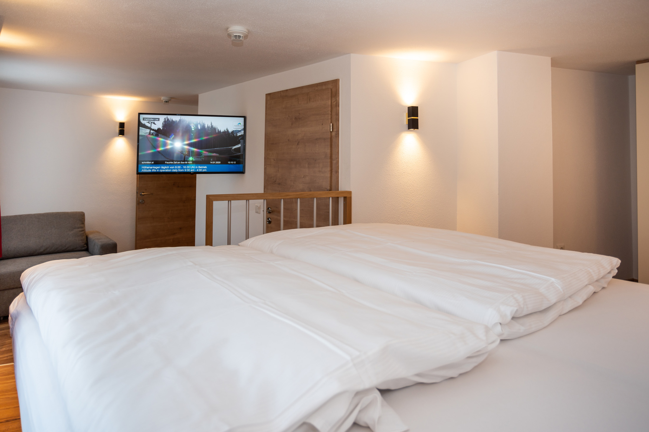 The deluxe apartment offers three bedrooms, each with a box spring bed and a flat screen TV. The living and dining area is equipped with a sofa bed for two people and flat screen TV. The fully equipped kitchen offers a dining table with space for up to eight people. This apartment has three bathrooms; one bathroom „en suite“ with shower and washbasin, another bathroom „en suite“ with shower, washbasin and toilet and a third bathroom with shower, washbasin, toilet and infrared sauna (space for 2 persons). A separate WC is also available. The WLAN is free to use. As a further highlight you can enjoy the wonderful view of the mountains and the city from your balcony.